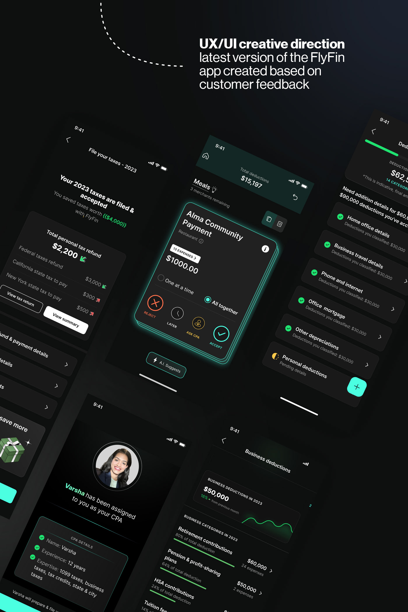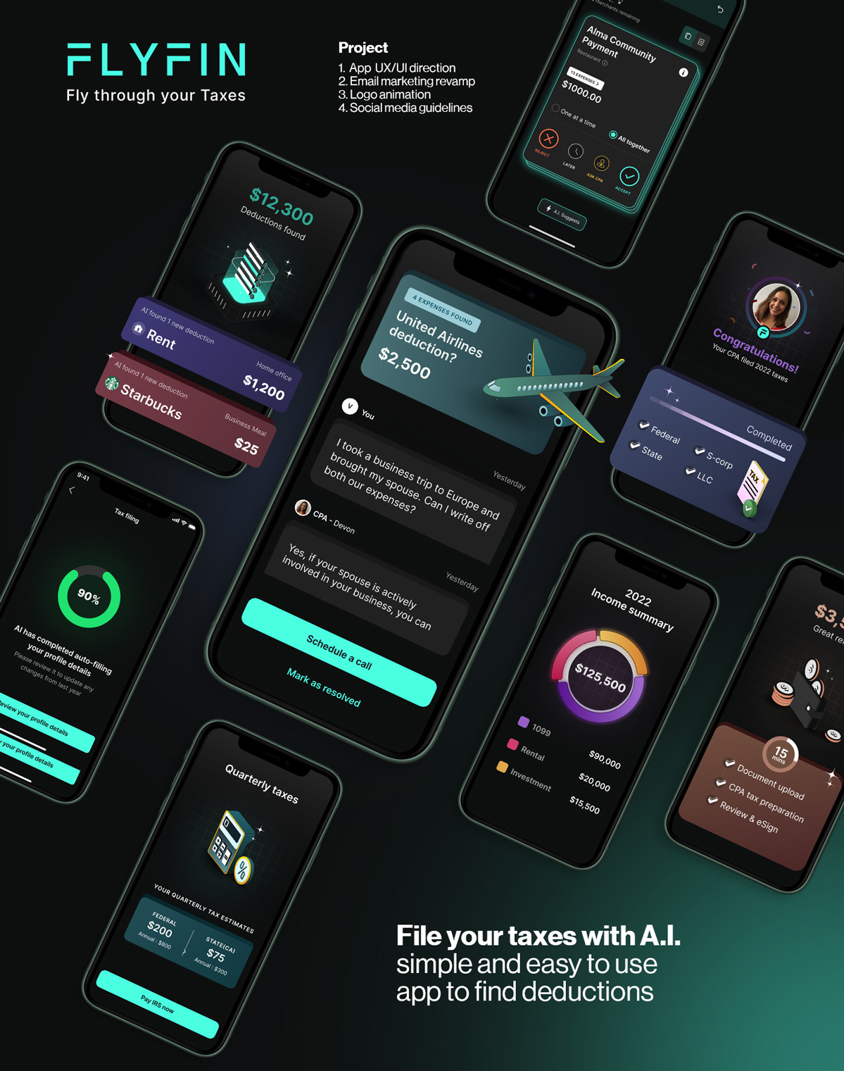 We collaborated with FlyFin to create a modern, user-friendly brand identity and experience, focused on simplifying tax filing through AI for freelancers and small businesses. Our team developed a clean, approachable visual identity and intuitive user experience, ensuring clarity in complex tax processes. We crafted clear messaging to explain the AI technology simply, reducing user anxiety, and iterated on design based on feedback to ensure a seamless final product. The result is a cohesive and accessible platform that resonates with the target audience while making tax filing easier and more efficient.