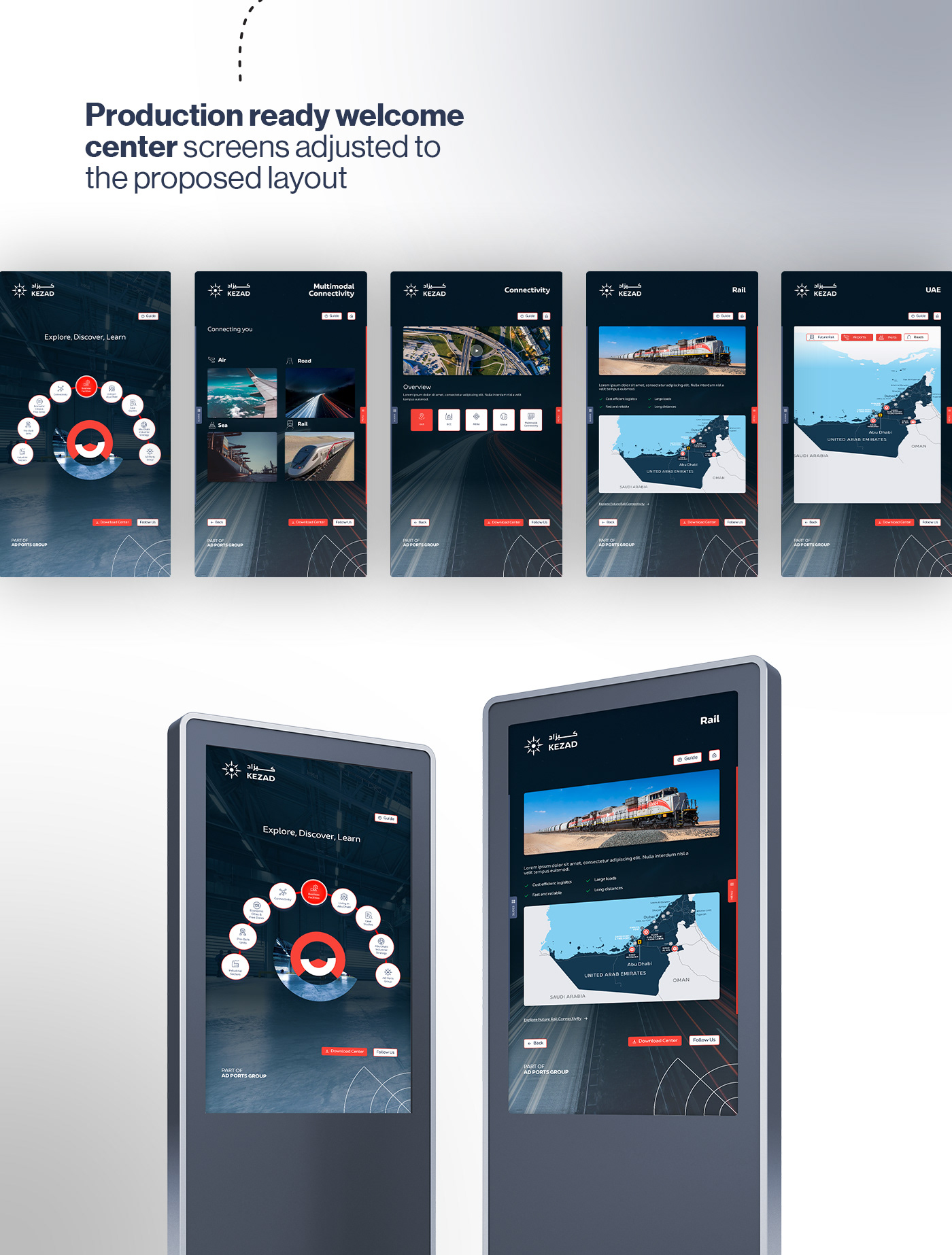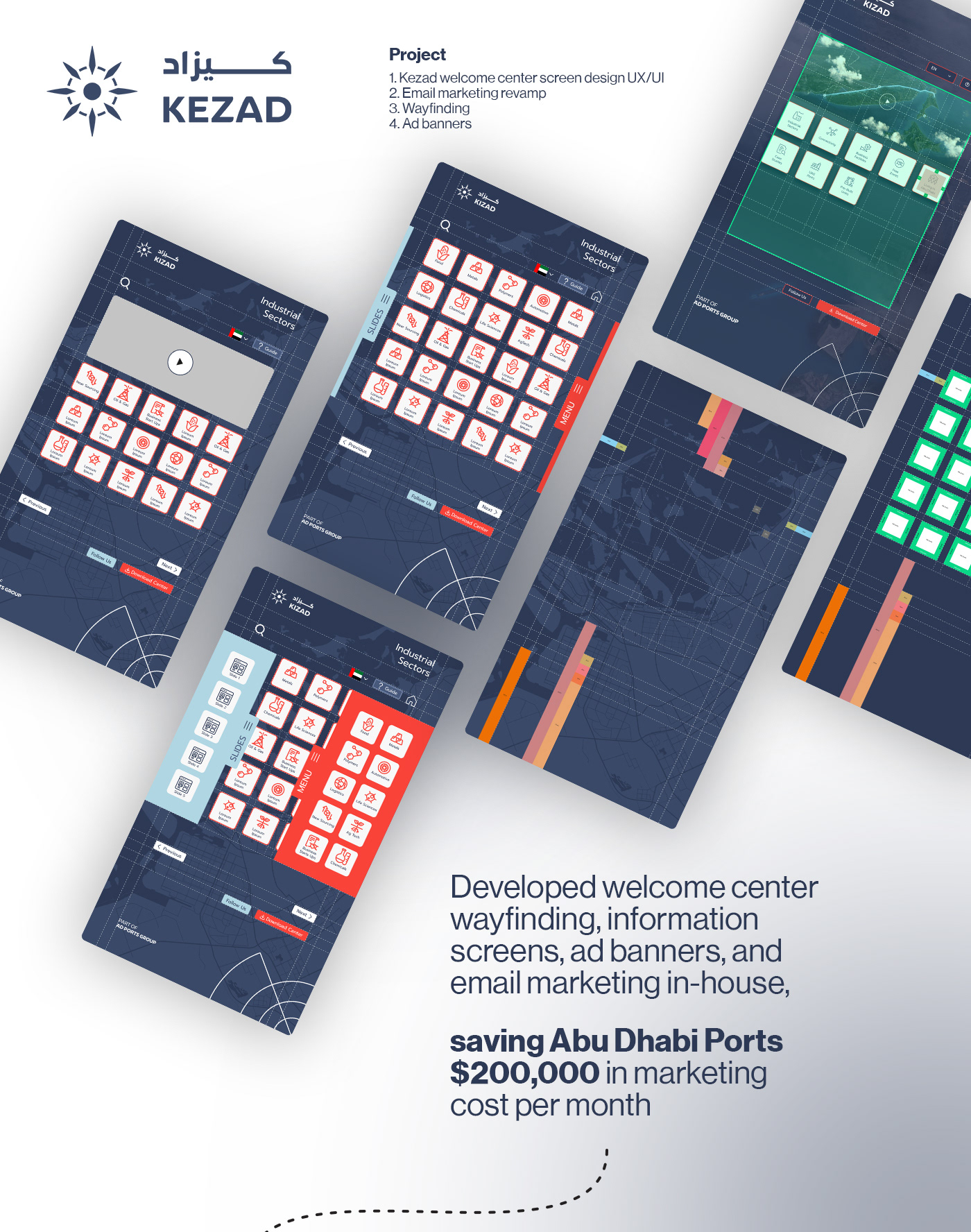 We led the UX/UI design and Marketing Strategy for Kezad Abu Dhabi Ports’ Welcome Center, creating an intuitive space that provides essential information to visitors. Our team also developed the design direction and marketing strategy, ensuring the center’s interface aligned with the brand’s identity. Through effective team leadership, we delivered an engaging and functional experience that enhances visitor interactions and strengthens the brand’s presence.